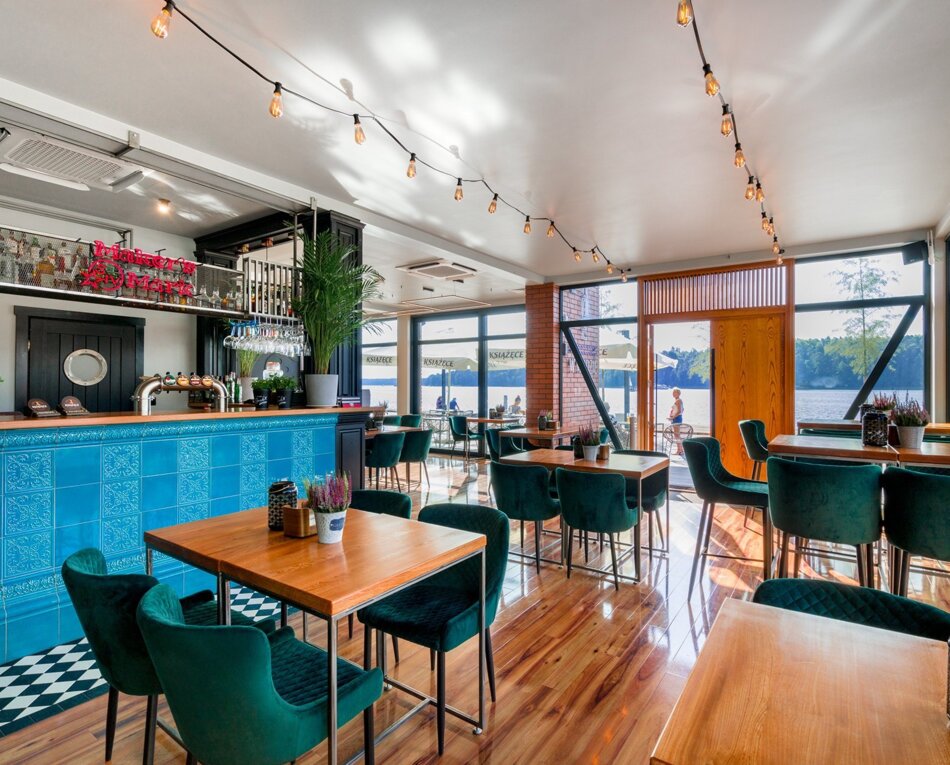 Wnętrze restauracji "Nóż w Wodzie" to harmonijne połączenie nowoczesności z naturą. Frontowa, przeszklona ściana, stanowiąca panoramiczny widok na Jezioro Mikołajskie, sprawia, że każdy posiłek staje się spektaklem dla zmysłów. Z każdym kęsem dania możesz podziwiać rozgrywający się na wodzie balet żagli, refleksy słońca tańczące na fali, a wieczorem – spokojne odbicia gwiazd na tafli jeziora. To unikalne połączenie elegancji wnętrza i majestatu natury, które stwarza idealne tło dla Twoich kulinarnych podróży.